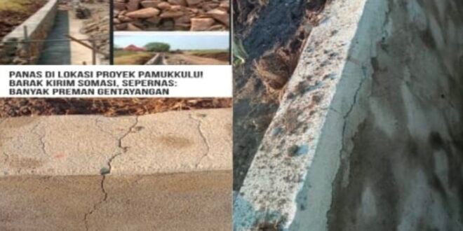 TAKALAR | POROS INFO.ID – Proyek Rehabilitasi Irigasi D.I Pamukkulu di wilayah kecamatan Mangarabombang Kabupaten Takalar. Mengalami retakan di berberpa struktur kualitas material di pertanyakan.