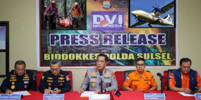 Makassar,porosinfo.id.-Bidang Kedokteran dan Kesehatan (Biddokkes) Polda Sulawesi Selatan menggelar konferensi pers terkait perkembangan identifikasi korban kecelakaan pesawat ATR 42-500. Kegiatan tersebut berlangsung di Biddokkes Polda Sulsel, Rabu (21/1/2026).
