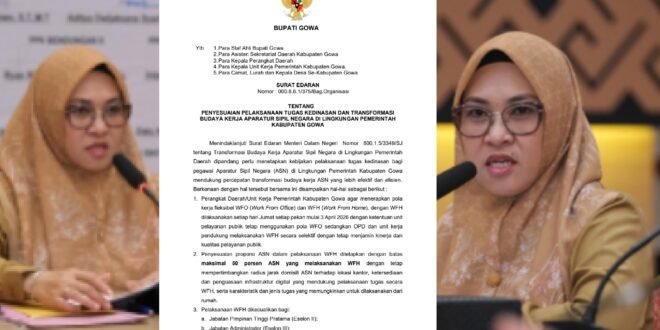 GOWA,porosinfo.id.-Surat Edaran (SE) Bupati Gowa, Sitti Husniah Talenrang tentang Penyesuaian Pelaksanaan Tugas Kedinasan dan Transformasi Budaya Kerja ASN di Lingkungan Pemerintah Kabupaten Gowa akan mulai memberlakukan bekerja dari rumah atau Work From Home (WFH) setiap pekan pada hari Jumat