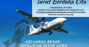 Gowa,Sulsel,poroainfo.id Keluarga Besar Kepolisian Resor (Polres) Gowa menyampaikan turut berduka cita yang mendalam atas musibah jatuhnya pesawat ATR 42-500 milik Indonesia Air Transport (IAT) di Puncak Gunung Bulusaraung, Kabupaten Pangkep, Provinsi Sulawesi Selatan, pada Jumat, 17 Januari 2026. Kapolres Gowa …