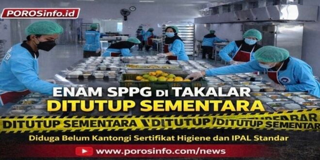 TAKALAR | POROS INFO.ID – Sedikitnya enam Satuan Pelayanan Pemenuhan Gizi (SPPG) di Kabupaten Takalar mendapat penutupan sementara setelah diduga belum memenuhi standar kelayakan higiene sanitasi dan pengelolaan limbah.