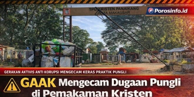 MAKASSAR | POROS INFO.ID – Gerakan Aktivis Anti Korupsi (GAAK) dengan tegas mengecam praktik dugaan pungutan liar (pungli) yang terjadi di area Pemakaman Kristen, Jalan Haji Kalla, Kelurahan Panaikang, Kecamatan Panakkukang, Kota Makassar.