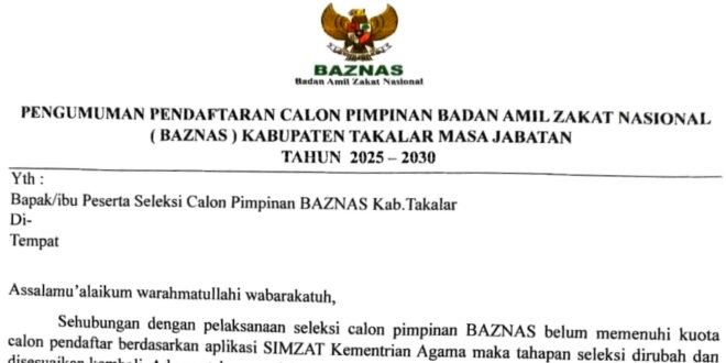 TAKALAR | POROS INFO.ID – Proses seleksi Calon Pimpinan Badan Amil Zakat Nasional (BAZNAS) Kabupaten Takalar masa jabatan 2025–2030 resmi mengalami penyesuaian jadwal. Perubahan ini dilakukan karena jumlah pendaftar melalui aplikasi SIMZAT Kementerian Agama belum memenuhi kuota yang ditetapkan, Senin (02/03/2026).