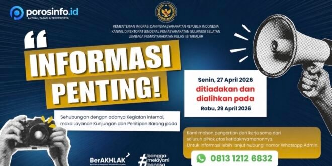 TAKALAR | POROS INFO.ID – Lembaga Pemasyarakatan (Lapas) Kelas IIB Takalar, di bawah Kantor Wilayah Direktorat Jenderal Pemasyarakatan Sulawesi Selatan, menyampaikan pemberitahuan penting kepada masyarakat terkait penyesuaian layanan, Minggu (27/04/2026).